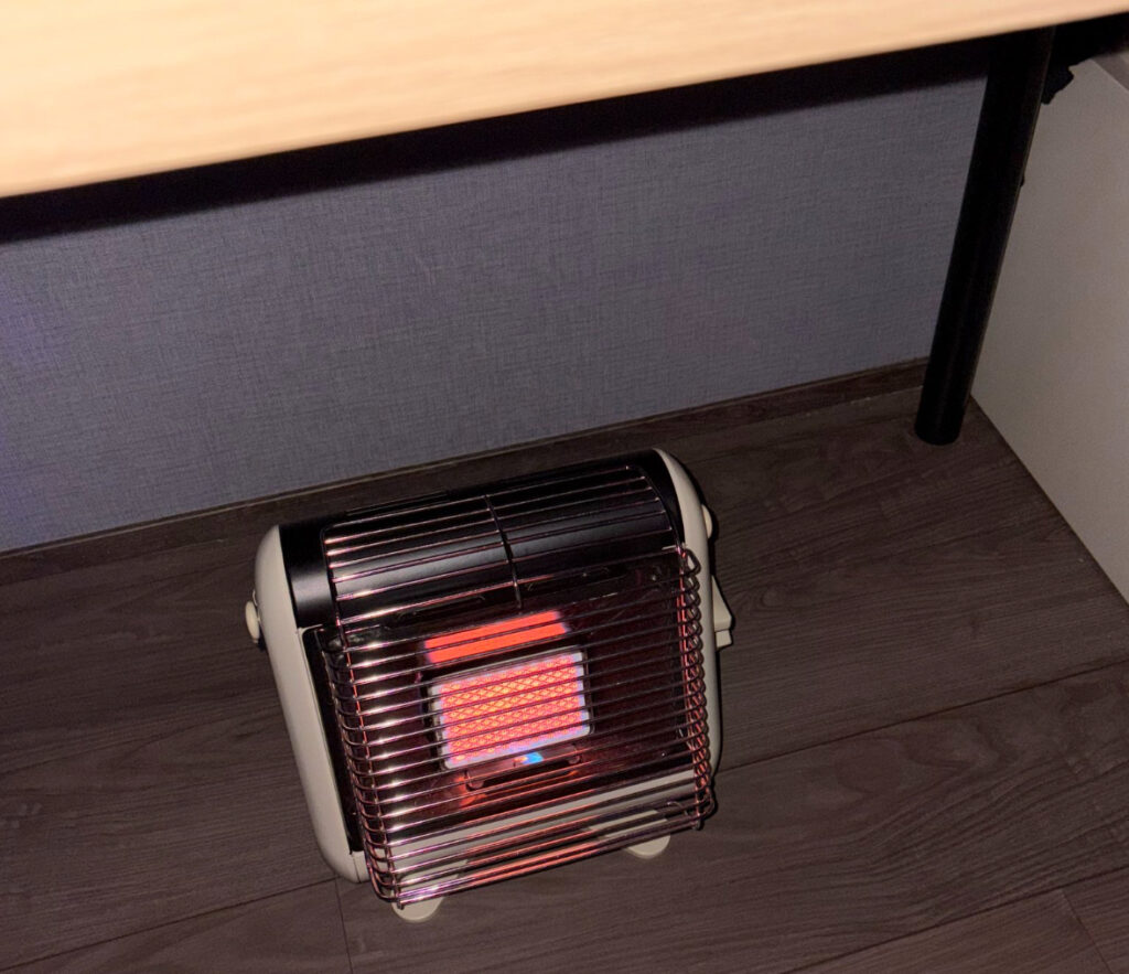 っていう静かな着火音と共に、数分後にはオレンジ色の燃焼筒と、優しい温風が顔に当たる。